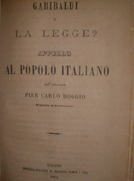 Le gesta di GIUSEPPE GARIBALDI contribuirono non poco all'UNITA' ITALIANA e soprattutto alla CONQUISTA DEL MEZZOGIORNO CON LA SPEDIZIONE DEI MILLE: lo straordinario successo di massa portò al movimento certamente democratico, ma anche piuttosto populista, noto come GARIBALDINISMO. Tuttavia il Governo italiano e lo stesso Cavour non potevano dimenticare nè l'originario legame di GARIBALDI col MAZZINI nè le sue vicissitudini con la giustizia sabauda come COSPIRATORE. Di fronte al timore che l'eroe nizzardo (destinato comunque a godere di duratura fortuna popolare) potesse cedere alle lusinghe delle masse meridionali che lo avrebbero facilmente acclamato come dittatore o sovrano si iniziò in seno al Parlamento una campagna dissuasiva, non priva di denigrazioni o di ambiguità, di cui un prodotto a stampa sono gli spunti apertamente polemici del RARO VOLUME sopra riprodotto nel frontespizio (da Biblioteca Privata) dell'onorevole PIER CARLO BOGGIO, noto avversario di Garibaldi che continuò, e probabilmente inasprì in ALTRA OPERETTA le sue osservazioni sul pericolo rappresentato da un GARIBALDI che, tentando un'ardua IMPRESA PER LA CONQUISTA DEL TIROLO AUSTRIACO, più semplicemente detta anche IMPRESA DI SARNICO (od in alternativa a questa cercasse di conquistare con forze proprie la ROMA DEI PAPI peraltro sotto protezione francese) si ponesse, con drammatiche conseguenze, in antitesi al Governo, al re e alle leggi del nuovo stato unitario italiano, senza alcun dubbio ancora caratterizzato da incerti equilibri e da una sequenza di ardui problemi