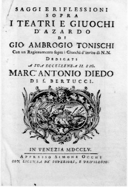 IN QUESTO VOLUME (GIOVANNI AMBROGIO TONISCHI, "SAGGI E RIFLESSIONI SOPRA I TEATRI E GIUOCHI D'AZZARDO, CON UN RAGIONAMENTO SOPRA I GIUOCHI D'INVITO DI N.N.", VENEZIA, PER SIMONI OCCHI, 1755, IN 4°), A DIMOSTRAZIONE DEL RILIEVO CHE NONOSTANTE LE PROIBIZIONI EBBERO SEMPRE I GIOCHI D'AZZARDO, SONO ELENCATI VARI TIPI DI DIVERTIMENTO IN USO IN TALIA NEL XVIII SECOLO, COMPRESI I GIOCHI CHE COMPORTAVANO PUNTATE IN DENARO