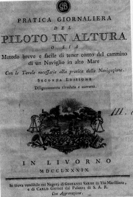 NELL'IMMAGINE SI VEDE LA RIPRODUZIONE ORIGINALE DI UN RARISSIMO VOLUME DI PRATICA DI NAVIGAZIONE AD USO DEI PILOTI D'ALTOMARE EDITO VERSO LA FINE DEL XVIII SECOLO