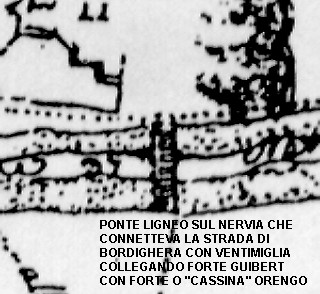 Stando alla descrizione delle condizioni climatiche che fa il Foscolo-Ortis nel celebre romanzo epistolare dell'agro di Ventimiglia viene da credere che il ponte in legno qui segnato, strutturalmente fragile [e verisimilmente continuazione di una tradizione storica di PONTI LIGNEI su questo torrente] fosse stato spazzato via da una delle tante formidabili piene del Nervia che devastarono queste contrade tra la fine del '700 e i primi dell'800. Non a caso però nella carta, che come si vede fu redatta non da un tecnico ma piuttosto da un uomo attento alle esigenze pratiche, risulta segnata (con doverosa punteggiatura e scritta esplicativa) una diramazione rispetto al ponte, una via alternativa che non immetteva direttamente nella strada di valle del Nervia che iniziava oltre la riva occidentale del Nervia, oltrepassato il ponte in legno. La diramazione segnata indica invece un percorso che conduceva verso Camporosso passando per una vasta area di campi e coltivi che stavano sulla riva orientale del Nervia e che si estendevano da qui sin agli insediamenti costieri di Vallecrosia. Procedendo per questa via, nel caso che il ponte sul Nervia non esistesse e che, come spesso accadeva, il vasto alveo del torrente al terminale della foce, tracimando per le piene, avesse costituito una zona semiallagata impraticabile, sarebbe stato possibile risalire sin all'area di Camporosso dove le più solide isole alluvionali avrebbero finito per costituire un guado onde oltrepassare il fiume. Senza naturalmente escludere l'ulteriore variante che si continuasse a procedere, come tuttora risulta possibile fare, sulla riva orientale del Nervia e raggiungere addirittura il borgo di Dolceacqua, dove il corso d'acqua indubbiamente si restringeva, specie in prossimità della chiesa cimiteriale di S.Giorgio ove esisteva un "guado": naturalmente, a mali estremi, tenendo sempre conto che poco oltre, proprio dal borgo antico di Dolceacqua, in cui ancora si vedevano le tracce delle devastazioni della guerra di successione al trono imperiale, uno splendido PONTE TARDO RINASCIMENTALE avrebbe permesso a chiunque, anche ad una persona appesantita da bagagli o accompagnata da animali da trasporto, di valicare le ribelli acque del Nervia e mettersi quindi nella condizione di procedere per Ventimiglia