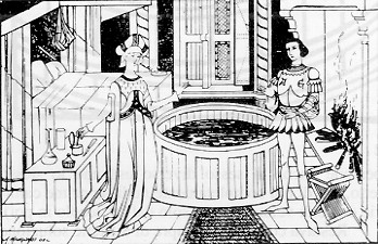 informat. B. Durante LA "PROMISCUITA' DEL BAGNO" ERA SUGGERITA DALLA NECESSITA' DI NON SPRECARE L'ACQUA VISTO CHE ERA IMPEGNATIVO E COSTOSO SIA TRASPORTARLA CHE RISCALDARLA (NEL XIII SECOLO ANCHE UN RE COME GIOVANNI SENZATERRA DI INGHILTERRA SI LAVAVA COSI'): QUESTO TIPO DI BAGNO, CHE AVVENIVA AL MASSIMO UNA VOLTA AL MESE, NON COMPORTAVA PROBLEMI MORALI IN QUANTO NEL MEDIOEVO IL CONCETTO DI PUDORE, IN UNA SOCIETA' MOLTO POCO REPRESSIVA PER QUANTO RIGUARDAVA IL CORPO UMANO, ERA MOLTO DIVERSO DALL'ATTUALE E SOPRATTUTTO DA QUELLO DEI SECOLI DEL RINASCIMENTO, SOPRATTUTTO DOPO GLI IRRIGIDIMENTI MORALI DI RIFORMA PROTESTANTE E CONTRORIFORMA CATTOLICA QUANDO IL PRINCIPIO DELLA PROMISCUITA' NEI BAGNI VENNE ABBANDONATO PER NON INCENTIVARE PROSTITUZIONE O DIFFUSIONE DI MORBI COME LA SIFILIDE. UNA GRANDE NOVITA' DEL '200 FU IMPORTATA POI DAI CROCIATI CHE INTRODUSSERO IN EUROPA L'USO DEL BAGNO TURCO