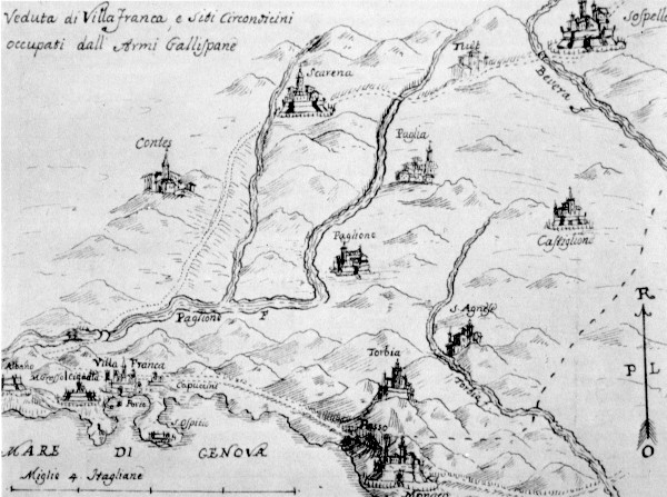 DA RACCOLTA PRIVATA (BORDIGHERA) - "VEDUTA DI VILLAFRANCA E SITI CIRCONVICINI OCCUPATI DALL'ARME GALLISPANE" - CARTA DEL 1744, DISEGNO A PENNA ACQUARELLATO DI CM.16,5 x 22 ATTRIBUITO, NON SENZA CONTESTAZIONI, A F. M. ACCINELLI