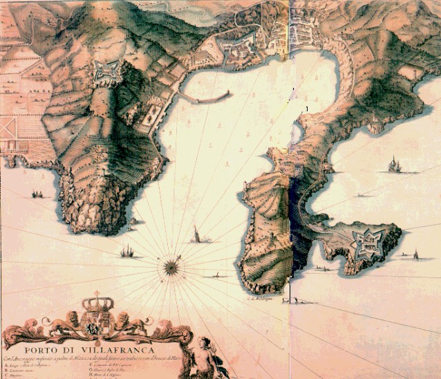 Nella stampa da incisione anonima (mm.473 x 545) su disegno di Gaspare Baldoino del 1661 [tratta dal "Theatrum Sabaudiae"] si nota il PORTO DI VILLEFRANCHE-SUR MER che, a metà XVIII secolo, fu sede di violenti scontri fra truppe fanco-spagnole e austro-piemontese che si contendevano l'importante base marittima e il controllo dei FORTI che la difendevano: rispettivamente, oltre al FORTE DI VILLAFRANCA (nella carta al centro e indicato con la LETTERA A) il FORTE DI MONTALBANO sulla sinistra di chi guarda e nella carta segnato con la LETTERA D e il FORTE DI S. OSPIZIO sulla destra di chi osserva e segnato con la LETTERA H. LA "CITTADELLA" FU COSTRUITA TENENDO CONTO DELL'EVOLUZIONE DELLE MODERNE ARTIGLIERIE CAPACI, CON PROIETTILI IN GHISA O BRONZO DI ABBATTERE LE MURAGLIE. PER QUESTO GLI INGEGNERI DI GUERRA ELABORARORNO UN PO' OVUNQUE UN NUOVO SISTEMA DI BALUARDI BASATO SUL DUPLICE ASSIOMA DEI BASTIONI CON TERRAPIENO E DEI PERIMETRI FORTIFICATI SENZA ANGOLI MORTI, FATTO CHE SI RISCONTRA IN MANIERA LODEVOLMENTE EFFICACE NELLA CITTADELLA DI VILLAFRANCA