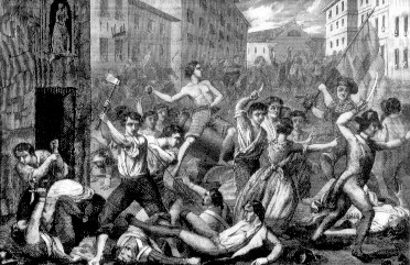 Stampa d'epoca di autore anonimo: "BALILLA" lancia il sasso contro gli artiglieri austriaci che, avendo perso il mortaio Santa Caterina, rimasto imprigionato nel fango della via si rivolsero con arroganza ai cittadini genovesi astanti pretendendo, quasi che fossero servi o schiavi, un aiuto immediato