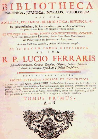 NELL'IMMAGINE SOPRA PROPOSTA SI VEDE IL FRONTESPIZIO DI UN'OPERA BASILARE DI DIRITTO CANONICO REALIZZATA NEL XVIII SECOLO DAL R. P. LUCIO FERRARIS E CUSTODITA IN BIBLIOTECA PRIVATA DI VENTIMIGLIA (SI TRATTA DELL'EDIZIONE VENEZIANA DELLO STAMPATORE RADICI DEL 1770).