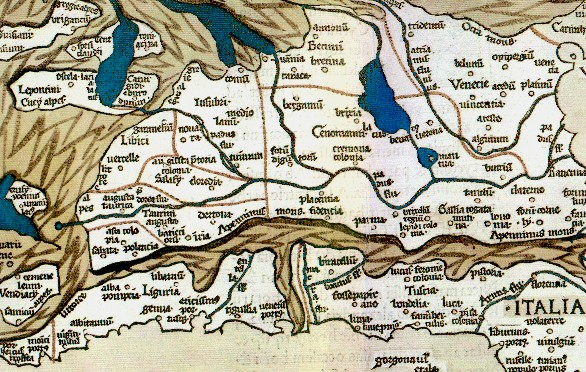 LA LIGURIA ANTICA [QUI CONFRONTABILE CON LA RIPRODUZIONE CHE NE VENNE FATTA NELLA TAVOLA DI PEUTINGER (PEUTINGERIANA)] NELLA RAPPRESENTAZIONE CARTOGRAFICA DI TOLOMEO CLAUDIO.