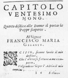 NELL' IMMAGINE SOPRA PROPOSTA SI VEDE LA PAGINA INIZIALE DI UN CAPITOLO (QUI DI SEGUITO PROPOSTO AGLI STUDIOSI NELLA SUA INTEREZZA) DELLO SCUDO DI RINALDO CHE L'ERUDITO E POLIGRAFO ANGELICO APROSIO DEDICO' AVVERSO GLI ECCESSI DELLA MODA, NEL SUO SECOLO, DI PORTARE LE POPPE SCOPERTE CIOE' ABITI FEMMINILI PROVOCANTI