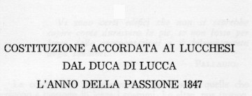 IL TESTO INTEGRALMENTE SOPRA RIPORTATO DELLA COSTITUZIONE DEL DUCATO DI LUCCA RAPPRESENTA UN PIU' CHE UNICO CASO LETTERARIO DI PARODIA E SATIRA SU UNA "COSTITUZIONE MAI CONCESSA" E QUINDI SULLA CADUTA DI UNO STATERELLO ITALIANO FILOAUSTRIACANTE.