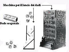 I DADI VENIVANO INSERITI NELLE APPOSITE FESSURE NELLA CORPO DELLA MACCHINA LUSORIA E SCENDEVANO ATTRAVERSO IL PERCORSO A LEI INTERNO, SECONDO LE PIU' SVARIATE CASUALITA', PER QUINDI RICADERE, COME SEGNATO NELLO SCHEMA, SUL TAVOLO, INNANZI AI GIOCATORI