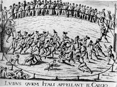 Nella stampa del 1644 tratta da originale di archivio privato è rappresentata una scena del GIOCO DEL CALCIO praticato a FIRENZE sin dai primi del XVI secolo e che l'erudito accademico GIOVANNI DE' BARDI descrisse in questo modo:"Il calcio è un gioco pubblico di due squadre di giovani a piedi e senz'armi, che si sforzano per divertimento e per onore, di portare nel campo avversario un pallone gonfiato d'aria".