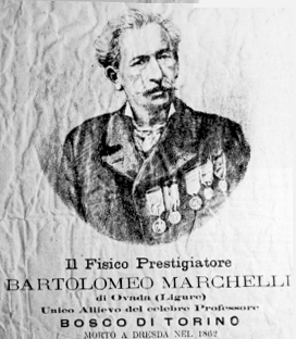 BENEDETTO MARCHELLI COME SI LEGGE NELLA STAMPA POPOLARE (CONSERVATA PRESSO L'ACCADEMIA URBENSE DI OVADA) FU ALLIEVO DI BARTOLOMEO BOSCO, MAESTRO SUPREMO DELL'ARTE DELL'ILLUSIONISMO E DELLA PRESTIDIGIAZIONE.