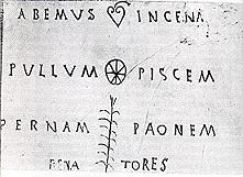 POMPEI RESTA, CON LE SUE STRAORDINARIE REPRTAZIONE, LA FONTE PIU' VASTA PER ACCOSTARSI ALLA CIVILTA' ROMANA ED AI SUOI ASPETTI DI VITA MINUTA: NELL'IMMAGINE E' RIPRODOTTA UNA TAVOLETTA CON INCISE IL MENU' DI UNA TABERNA OVE SI NOTANO ALCUNE CONSUETUDINI ALIMENTARI D'EPOCA IMPERIALE, TRA CUI, OLTRE A QUELLE (ABBASTANZA NOTE) DELLA CARNE DI PESCE, DI POLLO, E DI SELVAGGINA (PERNICE NEL CASO), ANCHE L'USO A TAVOLA DELLA PREGIATISSIMA CARNE DI PAVONE