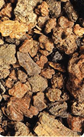 In commercio si ha la MIRRA ELETTA in lacrime rossastre fino a giallo brune e la MIRRA IN SORTE in masse agglutimnate brune opache miste con impurezza