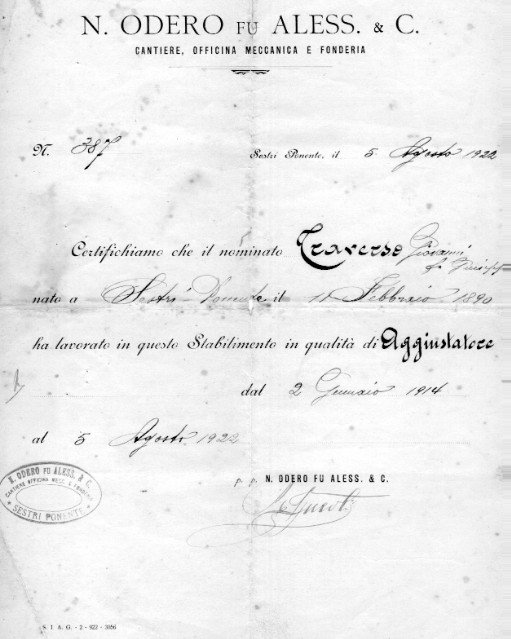 DA QUESTA SECONDA CERTIFICAZIONE DELLA SEGRETERIA AMMINISTRATIVA DEL PERSONALE DELLO STABILIMENTO NAVALE ODERO DI SESTRI PONENTE A GENOVA SI APPRENDE CHE GIOVANNI TRAVERSO AURELIO FU RIASSUNTO IL 2 GENNAIO 1914 (POI RESO OPERAIO MILITARIZZATO PER I SERVIZI BELLICI DEL 1915-1918)