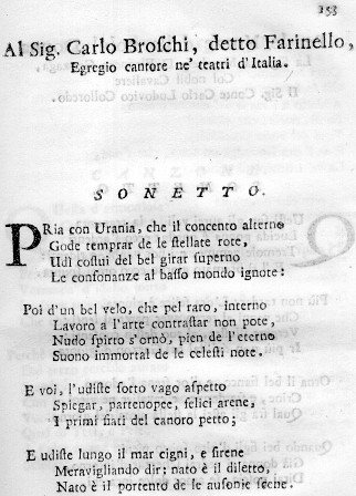 Nell'immagine tratta da un VOLUME ANTIQUARIO da BIBLIOTECA PRIVATA DI VENTIMIGLIA si puņ leggere questo SONETTO ENCOMIASTICO del poeta genovese CARLO INNOCENZO FRUGONI dedicato al FARINELLO (FARINELLI) nome d'arte di CARLO BROSCHI