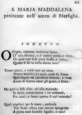Nell'immagine tratta da un VOLUME ANTIQUARIO da BIBLIOTECA PRIVATA DI VENTIMIGLIA si puņ leggere questo SONETTO AGIOGRAFICO del poeta genovese CARLO INNOCENZO FRUGONI dedicato alla GROTTA DI MARSIGLIA che avrebbe ospitato il romitaggio di MARIA MADDALENA