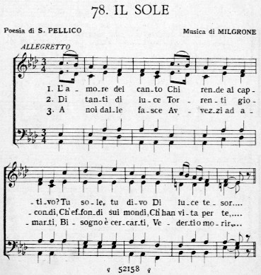 NELLE IMMAGINI SI POSSONO SCORRERE DUE TESTI MUSICATI DI SILVIO PELLICO (SULLA CUI VITA ED OPERE SI DANNO QUI ALCUNE NOTIZE TRATTE TESTUALMENTE DA E.M.FUSCO, SCRITTORI E IDEE, S.E.I., TORINO, 1956, SOTTO VOCE) POI ELETTI DA UNA DOCUMENTATA SILLOGE OTTOCENTESCA FRA I CENTO CANTI POPOLARI ITALIANI PIU' SIGNIFICATIVI: SPECIFICATAMENTE SI TRATTA DELLE ARIE L'AMORE DEL CANTO (MUSICATA DA MELGRONE) E SOPRATTUTTO LUNA E STELLE DELLA NOTTE (MUSICA DI S. MERCADANTE) TRATTA DALLA TRAGEDIA ESTER D'ENGADDI.