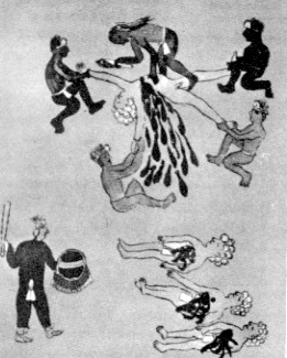 IMMAGINE TRATTA DAL "CODICE MAGLIABECHIANO"(XIII.3) DELLA BIBLIOTECA NAZIONALE CENTRALE DI FIRENZE. IL CODICE VENNE REDATTO DA UN INDIGENO POCO DOPO LA CONQUISTA DEL MESSICO E COSTITUISCE LA PIU' STRAORDINARIA TESTIMONIANZA DEL "CULTO DEL SANGUE E DEI SACRIFICI UMANI" VERSO IL TRAMONTO DELL'IMPERO DEGLI AZTECHI
