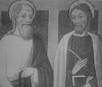 NELL'IMMAGINE SOPRA SI VEDE UN ALTRO PARTICOLARE DEI SUPERSTITI AFFRESCHI: IL PARTICOLARE IN CUI SEMPRE TOMMASO BIAZACI AFFRESCO' VERSO IL 1490 LE IMMAGINI DEI SANTI TOMMASO E MATTEO - FOTO ANTIQUARIA DA EX COLLEZIONE M. DE APOLLONIA - VENTIMIGLIA