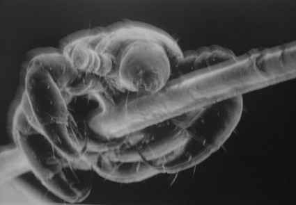 L'essere mostruoso dell'immagine è, senza voli di fantasia, un nemico istituzionale dell'uomo e più specificatamente dell'uomo povero o comunque dell'uomo che ha un limitato rapporto con l'igiene personale come usuale nell'età intermedia. Al microscopio elettronico, ingrandito migliaia di volte, si vede infatti, saldamente aggrappato a un capello umano, uno storico PARASSITA dell'uomo, precisamente il PIDOCCHIO DEL CAPO (PEDICULUS HUMANUS CORPORIS). Si tratta di un parassita degli Anpluri, Ordine di Insetti ectoparassiti, la cui femmina è in grado di depositare dopo una settimana dall'accoppiamento centinaia di uova che impiegano da 15 a 30 giorni per divenire adulti e prosperare ai capelli tra cui trovano un'impensabile quantità di alimenti. L'azione nociva di tale insetto non è limitata, come si pensa ancora in qualche caso, al prurito che provoca e all'eventuale infiammazione cutanea causata dal morso e dall'inoculazione di una sostanza anticoaugulante del sangue (è infatti ematofago = si nutre cioè anche di sangue umano). Attraverso la microscopica ferita può infatti inoculare vari morbi, anche mortali in assenza di adeguate terapie, come la spirochetosi o "febbre ricorrente" dovuta alla Spirocheta ricorrens e due rickettiosi: il "tifo esantematico" e la "febbre delle trincee". Sembra peraltro che sia in grado di trasmettere aanche il contagio della PESTE visto che l'insetto si infetta succhiando il sangue di uomini ammalati. Fino a quando non si elaborarono cure adeguate ed opportune profilassi la PEDICULOSI, cioè l'infestazione di PIDOCCHI (con tutte le conseguenze negative di cui si è detto), fu un male diffuso tra i ceti di ogni condizione: esso poteva altresì manifestarsi sotto forma di altri due parassiti il PIDOCCHIO DEL CORPO (PEDICULUS HUMANUS CORPORIS) e il non meno temibile PHITHIRIUS PUBIS di cui si tratta "cliccando" su QUESTO ULTERIORE COLLEGAMENTO
