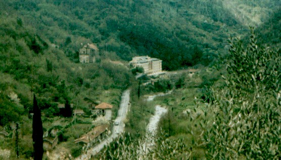 LO STRAORDINARIO SITO DI "LAGO PIGO" OGGI: A MEZZA COSTA LA CHIESA ROMANICA DELL'ASSUNTA, PIU' IN BASSO IL MODERNO COMPLESSO DELLE TERME DI PIGNA NELL'ALTA VALLE DEL NERVIA CHE, PER MOLTI ASPETTI (LOGISTICI MA SOPRATTUTTO CULTURALI) RIMANDA ALLA GRANDE TRADIZIONE IGIENICA ROMANO IMPERIALE DEI COMPLESSI TERMALI E DEI BAGNI PUBBLICI: LA VISTA DELL'ASSETTO VIARIO E DEL CORSO DEL TORRENTE NERVIA PERMETTONO GIA' IN QUESTA IMMAGINE MODERNA DI DEDURRE L'IMPORTANZA DEL SITO IN QUESTA ZONA DI TRANSITO DELL'ALTA VALLE DEL NERVIA