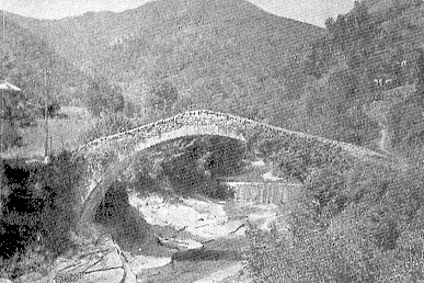 FRANCESCO FERRAIRONI in una sua utilissima GUIDA ARTISTICO MONUMENTALE DI TRIORA, (donde è ricavata la fotografia) dedica alcune pagine anche a MOLINI DI TRIORA e tra l'altro riproduce la seguente immagine del PONTE ROMANICO DI MOLINI DI TRIORA SUL TORRENTE ARGENTINA