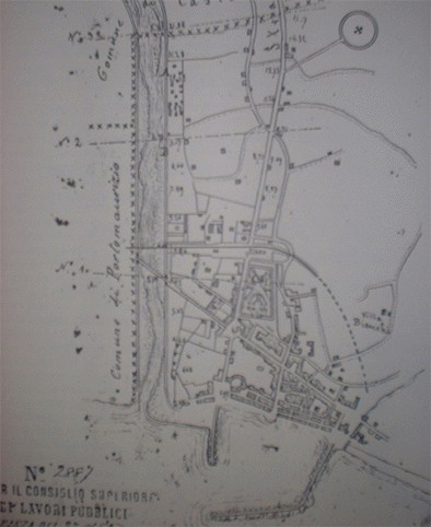 PIANO TOPOGRAFICO DEL 1886 IN CUI SI VEDE LA DELINEAZIONE, SULL'ARGINE DESTRO DEL TORRENTE IMPERO, DEL CONFINE TRA ONEGLIA E PORTO MAURIZIO (DOCUMENTO IN ARCHIVIO DI STATO DI IMPERIA - FOGLIO 369)