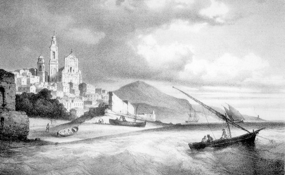 DA ARCHIVIO PRIVATO UNA VEDUTA DEL MARE E DELL'APPRODO MARITTIMO DI CERVO: DA LITOGRAFIA DI F. PERROT DEL 1838 (COLLEZIONE PRIVATA)