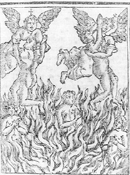 ANIME PURGANTI NEL FRONTESPIZIO DELL'OPERA, CUSTODITA ALLA CIVICA BIBLIOTECA APROSIANA DI VENTIMIGLIA, DI DIMAS SERPI INTITOLATA TRATADO DE PURGATORIO CONTRA LUTHERO Y OTRE HEREGES ED EDITA A BARCELLONA PER I TIPI DI JAYME CEUDRAT NEL 1604. NEL '600, IN PIENO SPIRITO DELLA CONTRORIFORMA SI ASSISTETTE AD UN FIORIRE DI OPERE CHE VALORIZZAVANO IL TEMA DELLA PENITENZA E DELLA CONFESSIONE (E QUINDI DELL'ESISTENZA STESSA DEL PURGATORIO) CONTRO LE AFFERMAZIONI LUTERANE E PROTESTANTI IN GENERE. IN CONFORMITA' AL CONCILIO DI TRENTO SCRIVE QUI L'AUTORE: "COME LA CHIESA CATTOLICA, EDOTTA DALLO SPIRITO SANTO, DALLE SCRITTURE E DALL'ANTICA TRADIZIONE DEI PADRI, HA INSEGNATO ATTRAVERSO I SACRI CONCILII E, DI RECENTE, IN QUESTO SINODO ECUMENICO [QUELLO DI TRENTO], IL PURGATORIO ESISTE E LE ANIME IVI RACCHIUSE TRAGGONO GRANDE GIOVAMENTO DALLE PREGHIERE DEI FEDELI, PURCHE' INNALZATE DA UN LUOGO IDONEO" (TRADUZIONE A CURA DI ANTONIO ZENCOVICH)