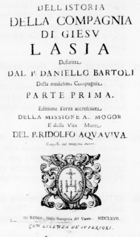 DANIELLO BARTOLI fu autore di questa celeberrima opera Dell'Istoria della Compagnia di Giesù, l'Asia, parte prima, edizione terza ed accresciuta della Missione al Mogor, della Vita e Morte del P. Ridolfo Acquaviva., Dell'Istoria della Compagnia di Giesù, il Giappone, seconda parte dell'Asia., Dell'historia della Compagnia di giesù, la Cina, terza parte dell'Asia.