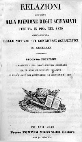 NELL' IMMAGINE SOPRA PROPOSTA SI VEDE LA PAGINA INIZIALE DELLA ORMAI RARISSIMA QUANTO IMPORTANTE II EDIZIONE DEL VOLUME INTITOLATO RELAZIONI INTORNO ALLA RIUNIONE DEGLI SCIENZIATI TENUTA IN PISA NEL 1839 CON L'AGGIUNTA DELLE NOTIZIE SUI CONGRESSI SCIENTIFICI IN GENERALE - II EDIZIONE, ACCRESCIUTA DEL REGOLAMENTO GENERALE PER LE ANNUALI RIUNIONI ITALIANE E DELL'ELENCO DEI COMPONENTI LA RIUNIONE DI PISA, TORINO, PRESSO POMPEO MAGNAGHI EDITORE, 1840, CON PERMISSIONE (LA I EDIZIONE PISANA DEL 1839 NON CONTENEVA ALCUNI ARTICOLI ED IN PARTICOLARE IL REGOLAMENTO GENERALE).
