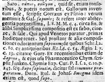 NELL'IMMAGINE SOPRA PROPOSTA SI VEDE LA VOCE SAPO TRATTATA NELLA I COLONNA DELLA P. 680 DE IL LEXICON MEDICUM BARTHOLOMAEI CASTELLI CURA ET STUDIO JACVOBI PANCRATII BRUNONIS PURGATUM AUCTUM. ACCESSERUNT HUIC NOVAE EDITIONI ERUDITISSIMI VIRI JOANNIS RHODII IN CASTELLI LEXICON PERUTILES, HOC SIGNO NOTATAE ADDITIONES (PATAVII, EX TYPOGRAPHIA SEMINARII APUD JOHANNEM MANFRE, 1721): DAL LESSICO, ESTREMAMENTE UTILE, SI RICAVA LA VALENZA MEDICINALE ATTRIBUITA AL "SAPONE", PUR SE CON CENNI CRESCENTI ALLE SUE FUNZIONI COSMETICHE (ARRICCHITE DAI PROFUMI CONFERITIGLI VOLTA PER VOLTA) E DETERGENTI.