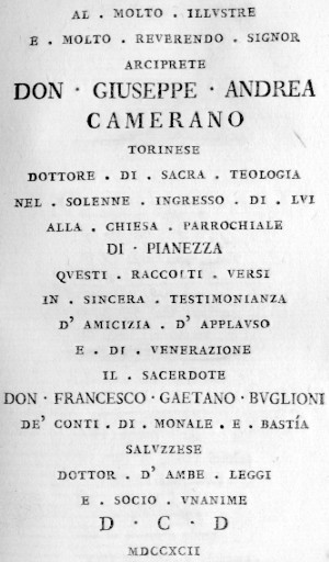 NELL'IMMAGINE SOPRA PROPOSTA SI VEDE IL FRONTESPIZIO DI UN'OPERA ACCADEMICA, INTITOLATA RACCOLTI VERSI, IN CUI, ANNO 1792, VENNE CELEBRATO DA MOLTEPLICI AMICI L'INGRESSO, NELLA CHIESA DI SUA TITOLARITA' DI PIANEZZA, DI "DON GIUSEPPE ANDREA CAMERANO.