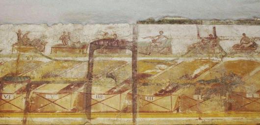 Infatti nello spogliatoio (apodyterium) del complesso termale, si è scoperto un gruppo di scene erotiche riproducenti amplessi tra coppie etero ed omosessuali, ma anche accoppiamenti fra tre o quattro personaggi, raramente rappresentati nell'arte erotica romana. L'elemento ancora più singolare è che le scene sono raffigurate al di sopra di elementi rettangolari simili a SCATOLE [come si vede nell'immagine sopra] ognuno dei quali contrassegnati da un numero progressivo da I a VIII [di cui si vede la sequenza sulla parete occidentale dello spogliatoio in questa IMMAGINE].