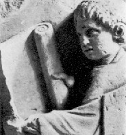 RILIEVO ROMANO DI UNO SCOLARO CHE APRE IL LIBRO, PIU' ESATTAMENTE SROTOLA IL PAPIRO; IMMAGINE EDITA IN "ALBINTIMILIUM..."