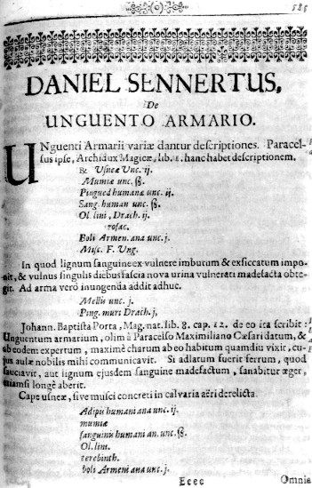 NELL'IMMAGINE SOPRA PROPOSTA SI VEDE L'INCIPIT DELL'OPERA (CONTENUTA NEL CORPUS DEL TEATRO SIMPATETICO [PP.585-598]) DELL'ARCHIATRA DANIEL SENNERTUS. IMPORTANTI SONO LE SUE CONSIDERAZIONI, PRO E CONTRO IL VALORE DI POLVERE SIMPATETICA ED UNGUENTO ARMARIO.