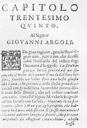 NELL' IMMAGINE SOPRA PROPOSTA SI VEDE LA PAGINA INIZIALE DI UN CAPITOLO (QUI DI SEGUITO PROPOSTO AGLI STUDIOSI NELLA SUA INTEREZZA) DELLO SCUDO DI RINALDO CHE L'ERUDITO E POLIGRAFO ANGELICO APROSIO DEDICO' AVVERSO GLI ECCESSI DELLA MODA DEL SUO SECOLO: PER QUANTO LA DISCUSSIONE SIA ENFATIZZATA DA GIOCHI LINGUISTICI BAROCCHI E TORMENTATA DA UN'EVIDENTE POSTAZIONE MASCHILISTA AVVERSO LE DONNE ESSA COSTITUISCE PUR SEMPRE UN DOCUMENTO INTERESSANTE PER INTENDERE UN CERTO METRO DI VALUTAZIONE DEGLI ABITI DELLA FEMMINILITA' BAROCCA SIA PER ENTRARE UN PO' PIU' DIRETTAMENTE NEL VARIEGATO MONDO DI CERTE ESASPERAZIONI ESTETIZZANTI DELL'EPOCA (PARTICOLARE ATTENZIONE VIENE ATTRIBUITA ALL'USO DEL GUARDINFANTE O INTELAIATURA DI LEGNO SU CUI POGGIAVANO LE AMPIE GONNE DEI VESTITI ALLA MODA: IL NOME DERIVAVA DALL'ORIGINARIA IDEAZIONE DI PERMETTERE ALLE DONNE, ANCHE IN AVANZATO STATO DI GRAVIDANZA, DI PARTECIPARE SENZA DAR SCANDALO ALLA VITA PUBBLICA, CONTESTUALMENTE PROTEGGENDO LA VITA CHE CRESCEVA LORO IN SENO = APPUNTO GUARDA= "PROTEGGI" L'INFANTE, NEL SENSO DI "FETO")