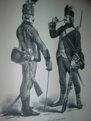 NELLA STAMPA D'EPOCA TRATTA DAL VOLUME "LA LIGURIA" SI VEDONO ALCUNE DELLE UNIFORMI DEI REGGIMENTI IMPERIALI AUSTRIACI CHE OCCUPAVANO GENOVA PRIMA DELLE FAMOSE 6 GIORNATE, SUSSEGUENTI ALL'EPISODIO DI G. B PERASSO (IL BALILLA), CON CUI IL POPOLO DI GENOVA CACCIO' GLI OPPRESSORI
