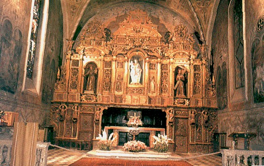 NELL'IMMAGINE DI PROMOZIONE TURISTICA SI VEDE L'ALTAR MAGGIORE, CON UNA PALA D'ALTARE IN LEGNO SCOLPITO E DORATO DEL 1663, CHE RAPPRESENTA IL PIU' SIGNIFICATIVO ELEMENTO DECORATIVO IN STILE BAROCCO DELLA "CHIESA E MONASTERO DI CIMIEZ". LA CHIESA E' CARATTERIZZATA DA UNA FACCIATA IN STILE GOTICO TROBADORICO PROPRIO DI CERTE COSTUMANZE ARTISTICHE DEL XIX SECOLO ANCHE SE E' PRECEDUTA DA UN PORTICO DATATO DEL 1662 (IL COMPLESSO MONASTICO E' COMPLETATO DALLA PRESENZA DI DUE CHIOSTRI DI CUI UNO SECENTESCO ED UN SECONDO PROPRIO DEL XVIII SECOLO)
