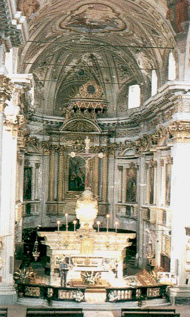 LA PIANTA DELLA CHIESA E' LINEARE, COSTITUITA DA UNA FIANCATA AI CUI LATI CORRONO DUE NAVATE PRIVE DI CAPPELLE. LO SPAZIO ARCHITETTONICO E' DECISAMENTE CONCENTRATO VERSO IL CORO OVE SI ESALTANO VARI ASPETTI DELLA SCENOGRAFIA BAROCCA CHE LO DISTINGUE. IN PARTICOLARE UN ARCO TRIONFALE SEGNA I LIMITI DELLA DIVISIONE TRA UMANO E DIVINO, E LE VARIE LINEE ARCHITETTONICHE, DALLE COLONNINE, ALLE VETRATE, ALLE NERVATURE DELLA VOLTA, PAIONO FINALIZZATE ALLO SCOPO DI TRACCIARE I CONFINI ASSOLUTAMENTE PRECISI DEL SACRO