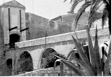 SOPRA L'INGRESSO FORTIFICATO ALLA CITTADELLA REALIZZATA DOPO IL ROVINOSO ASSEDIO TURCHESCO DI NIZZA DA UNA STAMPA ANTIQUARIA UNA VEDUTA SUGGESTIVA DI VILLAFRANCA ANTICA