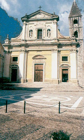 QUESTA CHIESA ERA ANTICAMENTE STATA ELEVATA AL RANGO DI CATTEDRALE PER IL FATTO CHE LA LOCALITA' AVEVA ADERITO, AI PRIMI DEL XIV SECOLO, ALLA SCELTA DEI PAPI, SOTTO L'INFLUENZA FRANCESE, DI TRASFERIRE LA SEDE DEL PAPATO AD AVIGNONE. COME VIEN SCRITTO NELL'UTILISSIMO LAVORO SUL BAROCCO LIGURE NIZZARDO (PP.38-39) QUESTA SITUAZIONE, CONNESSA ANCHE ALL'IMPORTANZA RAGGIUNTA NEL TRECENTO DAL COMUNE DI SOSPELLO, FU EVIDENZIATA DA UNA NOTEVOLE FIORITURA SIA ECONOMICO-SOCIALE CHE INTELLETTUALE ED ARTISTICA. IN PARTICOLARE LA CHIESA DI SAINT-MICHEL RISULTA INNESTATA ENTRO UN PECULIARE COMPLESSO DEMICO: UNA VIA STRETTA SI ALLARGA VIEPPIU' PER APRIRSI COREOGRAFICAMENTE NELLA GRANDE PIAZZA SU CUI SI STAGLIA LA FACCIATA DELL'EDIFICIO SACRO. L'ATTUALE EDIFICIO, DI IMPRONTA CHIARAMENTE BAROCCA, E' LA RIVISITAZIONE ARCHITETTONICA DI UNA CHIESA ROMANICA CUI, SECONDO L'USO DEL TEMPO, ERA ANNESSO UN CIMITERO: ATTUALMENTE DELL'ANTICO STILE ROMANICO RESTA TESTIMONIANZA IL NOTEVOLE CAMPANILE DI TRADIZIONE CULTURALE LOMBARDA DATATO DEL XIII SECOLO.