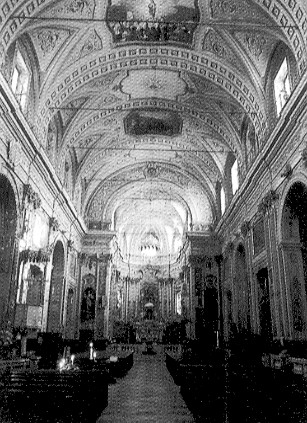 La fabbrica religiosa di questa CHIESA COLLEGIATA si individua ai limiti dello sviluppo dell'insediamento tardomedievale (piazza Gastaldi) nel punto nevralgico che segna il discriminante tra lo sviluppo medievale del complesso demico e quello barocco. Stando ai documenti superstiti la chiesa fu eretta nel 1675 su ruderi di una priore chiesa medievale dalle dimensioni pressoché analoghe. E' noto il nome di chi intraprese l'iniziativa (il cardinale tabiese Girolamo Gastaldi) ma gli esperti ritengono di non avere dati sufficienti per suffragare in maniera lineare la paternità del progetto dell'opera seicentesca. Si va comunque sviluppando l'idea che il disegno originario spetti a Giuseppe Arcucci, architetto romano nelle grazie del mentovato cardinale Gastaldi, mentre l'ingegnere che materialmente diede corpo al progetto potrebbe essere stato Girolamo Arlotti di Riva Ligure, all'epoca piuttosto operoso nella zona. La FACCIATA della chiesa, che fa da quinta alla piazzuola, si conchiude per via di un timpano triangolare mentre l'INTERNO della fabbrica si evidenzia con solennità distinguendosi per l'alternanza, lungo le pareti longitudinali, tra cappelle arcuate ed cappelle minori provviste di architrave. Sono da ammirare le lunette che si aprono sulla volta a botte dell'edificio e che forniscono alla chiesa barocca un'illuminazione anche sovrabbondante rispetto allo stile che la caratterizza (foto ex archivio privato M. De Apollonia - Ventimiglia)