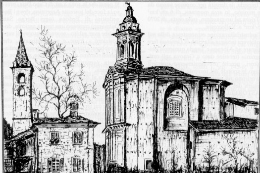 LA PARROCCHIALE DI ACQUETICO CON IL RELATIVO ORATORIO IN UN QUADRO A CHINA PROVENIENTE DA UNA COLLEZIONE PRIVATA