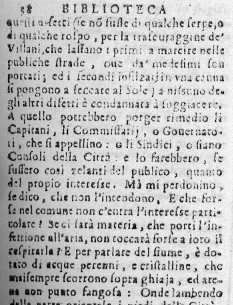APROSIO IN QUESTA PAGINA DELLA BIBLIOTECA APROSIANA VOLENDO DIFENDERE VENTIMIGLIA DALLA NOMEA DI LUOGO INSALUBRE CI INFORMA DIRETTAMENTE E NON DEI PROBLEMI IGIENICI DEL SUO TEMPO E SPECIFICATAMENTE DELLA LIGURIA. NELLA PAGINA PRECEDENTE (P.37) SOSTIENE CHE LE CONTAMINAZIONI AMBIENTALI SONO DIFFUSE PER LA CARENZA DI ADEGUATE PREVIDENZE IGIENICI-SANITARIE: IN PARTICOLARE DENUNCIA (A SAMPIERDARENA ED ALBARO) LA CONTAMINAZIONE AMBIENTALE COME CAUSATA DA ESALAZIONI NOCIVE, DA VAPORI MALEODORANTI, DA "CALIGINI E FUMI", SOPRATTUTTO DA "FETORI DI ACQUE MORTE, DA SERPI INFRACIDITI, E DA CADAVERI O SIAN CAROGNE.