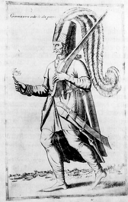 UN "GIANNIZZERO TURCO" (TAVOLA INCISA IN RAME A PIENA PAGINA) NEL RARO VOLUME DI "NICOLAS DE NICOLAY" INTITOLATO "LE NAVIGATIONI ET VIAGGI FATTI NELLA TURCHIA...CON DIVERSE SINGOLARITA' VISTE & OSSERVATE IN QUELLE PARTI DALL'AUTORE CON SESSANTASETTE FIGURE NATURALI, SI' DI UOMINI CHE DI DONNE, SECONDO LA VARIETA' DELLE NATIONI, DE LORO PORTAMENTI, DE GESTI, DE HABITI, DELLE LEGGI, DE RITI, DE COSTUMI & DE MODI DI VIVERE IN TEMPO DI PACE & DI GUERRA" (VENEZIA, FRANCESCO ZILETTI, 1580): RIPRODUZIONE DAL VOLUME ORIGINALE