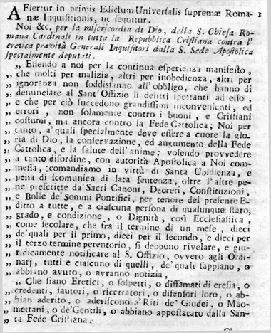 NELL'IMMAGINE SOPRA RIPRODOTTA, DA TESTO CANONICO DEL XVIII SECOLO SI VEDE LA PAGINA INIZIALE DELL'EDITTO UNIVERSALE DELLA SUPREMA INQUISIZIONE ROMANA DEL 10 MARZO 1677