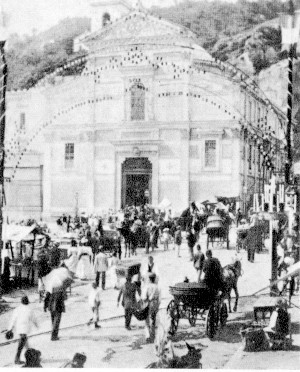 NELLE IMMAGINI ANTIQUARIE, CUSTODITE IN "ARCHIVIO DEL MUSEO DELLA CANZONE DI VALLECROSIA (IM)" SI VEDONO DUE SCORCI CARATTERISTICI DELLA NAPOLI OTTOCENTESCA: NELLA I IMMAGINE SI VEDE UN DETTAGLIO DELLA POPOLARISSIMA CHIESA DI PIEDIGROTTA MENTRE NELLA SECONDA RIPRODUZIONE SI VISUALIZZA UN PARTICOLARE DI VITA CITTADINA A SANTA LUCIA.