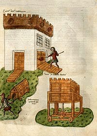 MACCHINE DA GUERRA tratte dal manoscritto (1455) DE RE MILITARI : qui MACCHINA DA ASSEDIO E DA INCENDIO vedi ALTRA IMMAGINE.