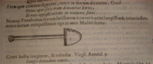 Nell'immagine l'incisione rappresenta un esemplare di VENABULUM custodito nel MUSEO proprietà dell'autore del VOLUME cui appartiene la riproduzione, il celebre antiquario seicentesco GIOVANNI BATTISTA CASALI.